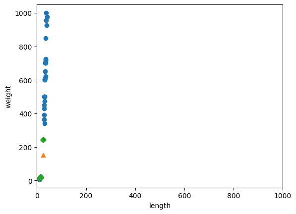 가로와 세로의 비율이 맞지 않아 더 가까운 도미의 데이터를 나 두고 빙어의 데이터를 참조하여 이와 같은 문제가 발생했던 거다.