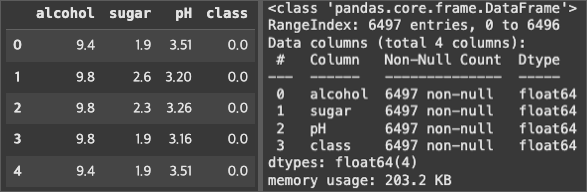 와인의 데이터를 확인해보니 약 6497개의 샘플이 있고, 4개의 열은 모두 실수인 것을 확인할 수 있다.