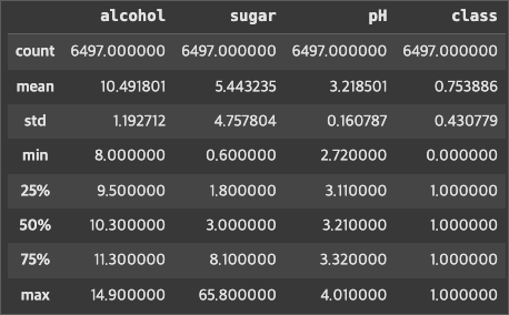 < 와인 데이터의 통계 값 > mean : 평균, std : 표준 편차, min : 최소, 25% : 1사분위수, 50% : 중간값/2사분위수, 75% : 3사분위수 max : 최대