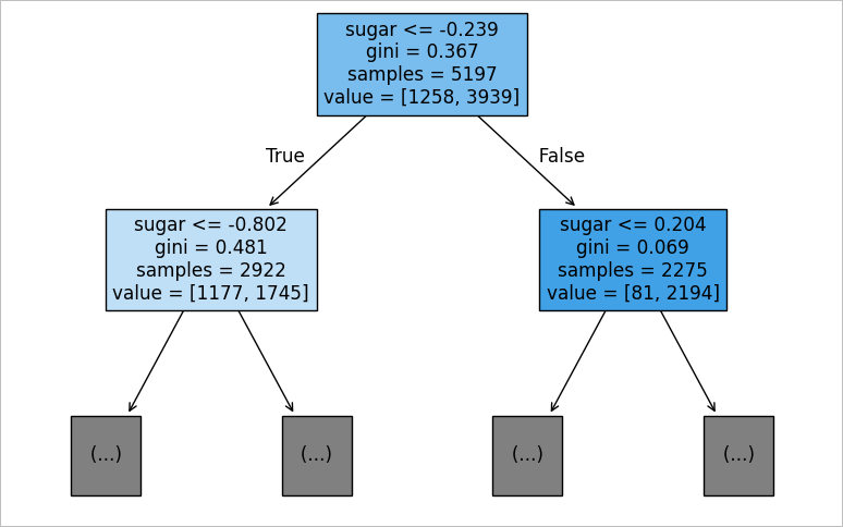 plot_tree(dt, max_depth=1, filled=True, feature_names=['alcohol', 'sugar', 'pH'])