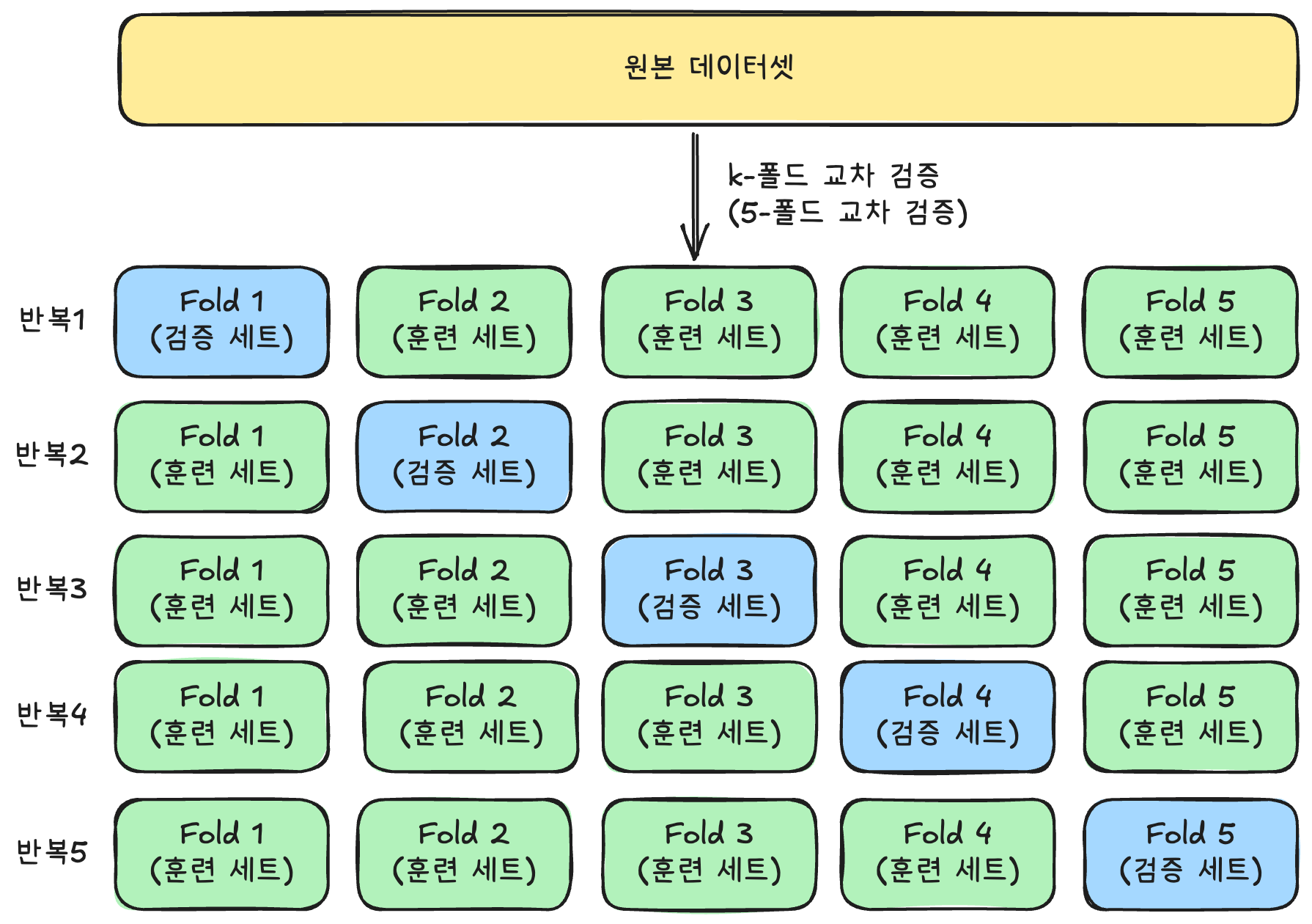 | 방식 | 데이터 일부를 떼어내 평가용으로 사용 | 데이터를 여러 개로 나누고 여러 번 학습+평가 반복 |