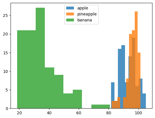 위 히스토그램으로는 바나나는 확실히 구분이 가능하지만 사과, 파인애플은 구분이 어렵다.